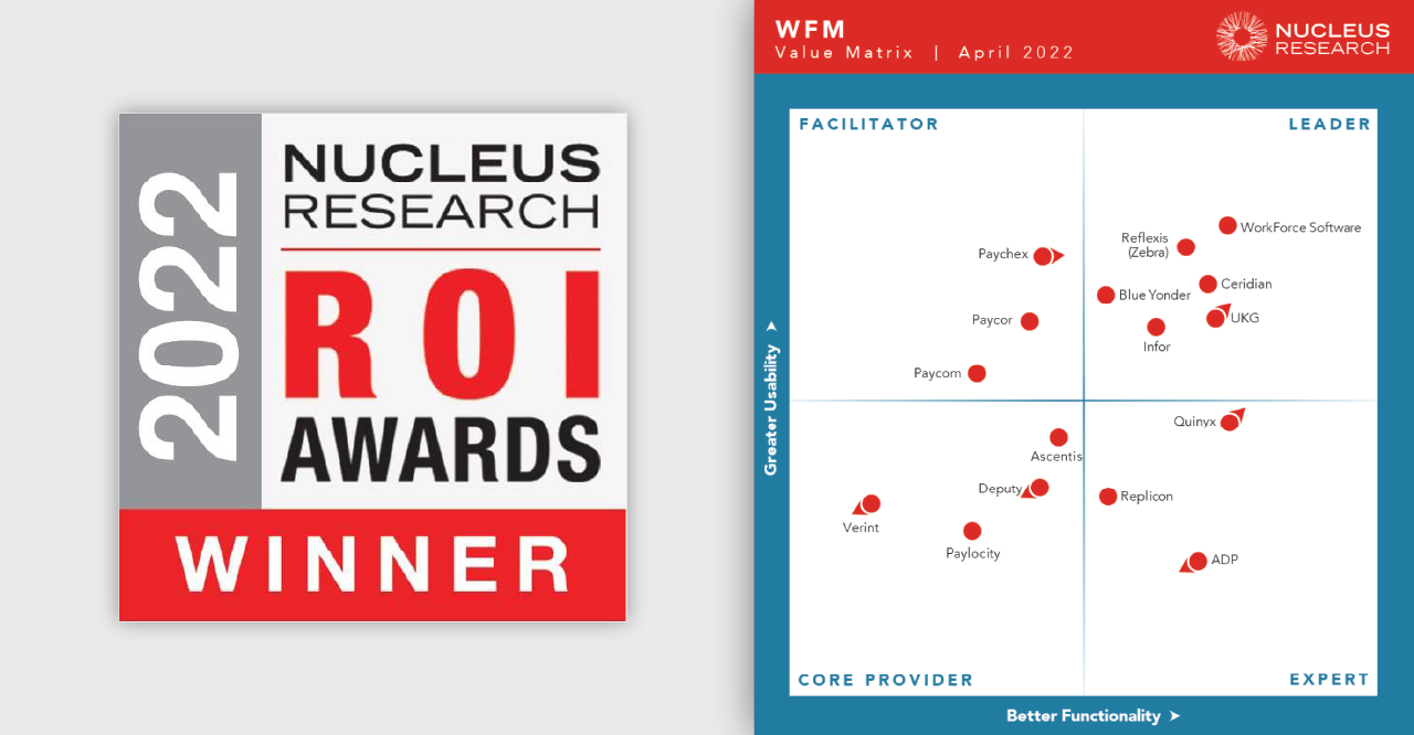 Nucleus Research – Top Leadership Position in the 2022 WFM Value Matrix: We're honored to be recognized by Nucleus Research as the leading workforce management vendor for the value, functionality, and usability of our solutions in the 2022 WFM Technology Value Matrix.
